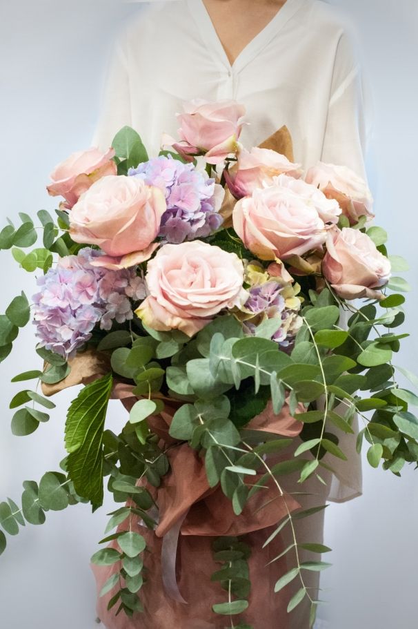 В един от най-атрактивните ни букети се преплитат розово-лилави нюанси, нежност и много стил. Красиви и ароматни розовите рози стоят в основата на този красив букет, а пищните бледо лилави хортензии ги допълват. Добавяме евкалипт, за да бъде букетът наистина завършен. Обвиваме всичко в плат и завързваме с деликатна сатенена панделка.