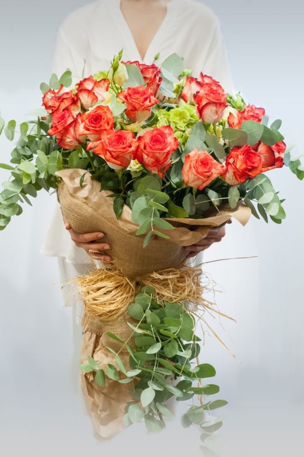 Уникален букет в красива и нетрадиционна цветова комбинация. Към деликатните двуцветни рози в бяло и оранжево добавяме пищните и красиви хортензии в зелено, а завършекът е евкалипт. Опакован в зебло и голяма панделка от натурална рафия, този букет носи усещането за свобода и непреходен стил.