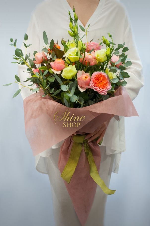 В невероятно красив букет сме събрали седем божурести розови рози, четири зелени еустоми и зеленина евкалипт. Обгърнат в стилен плат и завързан със сатенена панделка, букетът е готов да зарадва Вашия любим човек!