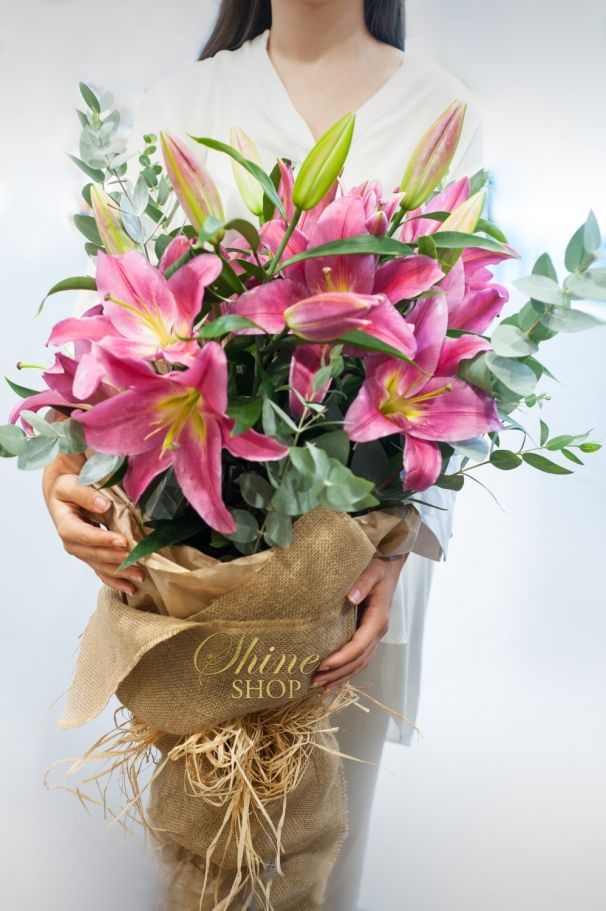 Този красив букет може да подарите за всеки повод, а защо не и да направите един обикновен ден малко по-специален. Пет ароматни розови лилиума и евкалипт образуват неочаквано добър синхрон. Искате букетът да е по-голям? Тогава изберете броя на цветята според желанията си. Щ опаковаме със зебло и ще завършим с голяма панделка от натурална рафия.