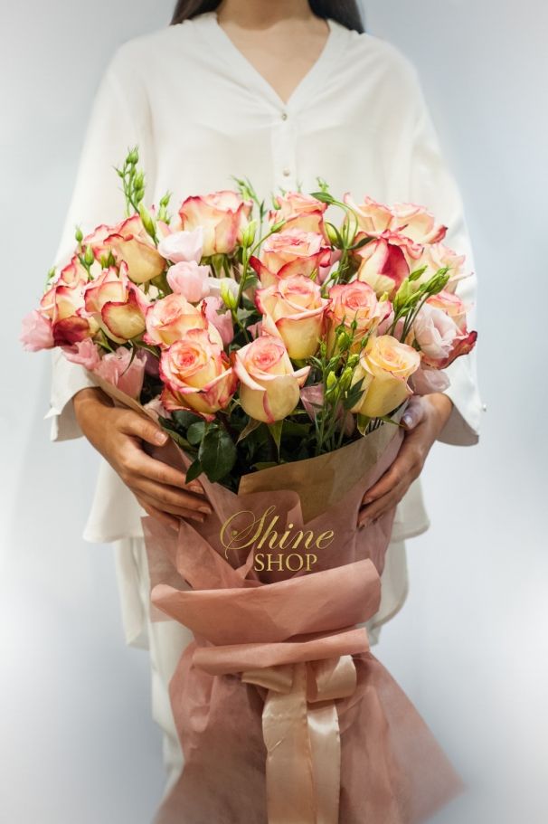 Прекрасен букет, който ще се превърне в любимия подарък на всяка дама. Двуцветните нежни рози и светло розовите еустоми са достатъчни да усмихнат и най-претенциозния клиент. Обвиваме тази красота в плат в същия нюанс на розовото като еустомите и завързваме със сатенена панделка.