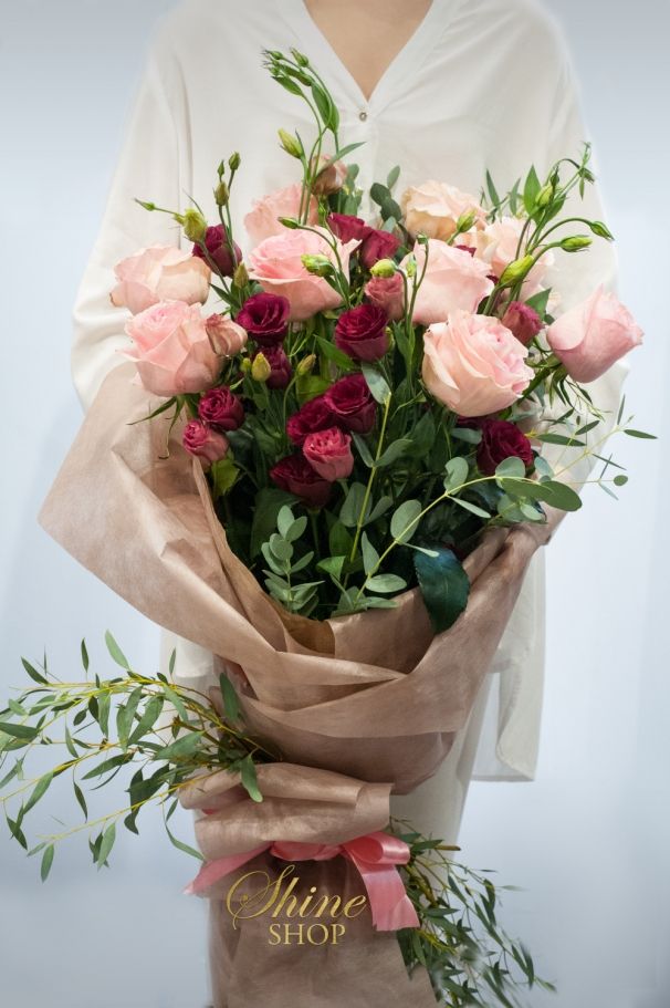 Нежен и изящен букет за дами с изискан вкус. Класическите розови рози сме комбинирали с нежни тъмно розови еустоми и сме добавили зеленина евкалипт, за да бъде този букет наистина завършен. Обгръщаме цветята в стилен плат в цвят екрю и завързваме розова панделка от сатен.