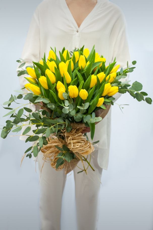 Очарователен и ярък букет, подходящ да предизвика усмивки на всеки повод. Изберете колко жълти лалета да сложим във Вашия букет, а ние ще добавим евкалипт. Цялата тази красота опаковаме в зебло и завързваме с натурална рафия. Вашият букет ще бъде напълно завършен, когато изберете картичка.