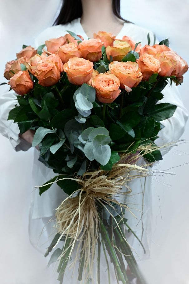 Този букет от красиви и ароматни рози и евкалипт не може да остане незабелязан. Изберете 15, 25 или 51 бр. оранжеви рози искате да опаковаме за Вас и не забравяйте да добавите картичка. Подарете на любим човек с повод или без!