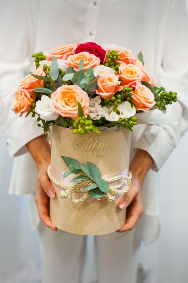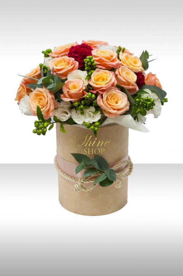 Нежна кутия с цветя в елегантни цветни тонове, която ще зарадва любим човек за спецалния му ден, а защо не и без повод. В центъра на тази цветна кутия сме поставили червени целозии, те не може да останат незабелязани. В тяхната компания цъфтят оранжеви рози и бели еустоми. Елегантността не изисква още много, може би малко зеленина. Няколко стръка евкалипт ще направят тази красива кутия с цветя завършен подарък.