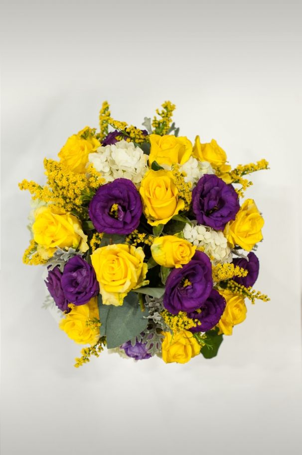 Свежа кутия с цветя, която може да поднесете на любим човек за повод или просто да украсите дома си с нея. Екрю и злато – в тези цветове е кутията, но вътре в нея е много по-цветно. Жълтите рози носят настроение и правят този букет толкова слънчев. Компания им прави бялата хортензия, чиито деликатни малки цветове подхождат отлично на всяка цветна аранжировка. За да бъде тази кутия наистина впечатляваща добавяме тъмно лилави еустоми. Те са акцентът, се забелязва веднага. Зеленина солидаго е финалният детайл.