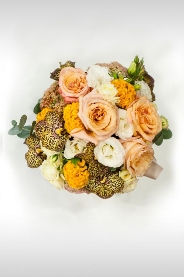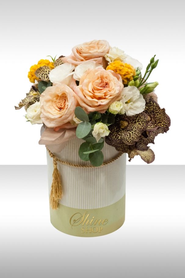 Прекрасна и нетрадиционна кутия с цветя за любителите на нестандартните предложения. Двуцветната оребрена кутия в бяло и златно е събрала класически светли цветове и един впечатляващ акцент. Веднага прави впечатление цветът на орхидея ванда в тази кутия. Пъстър, живописен, малко див. Изберете 1 или 2 клона от тази нестандартна орхидея искате да поставим във Вашата кутия. Рози в цвят екрю, те създават усещане за ефирност и лекота. Допълваме чувството за свежест с бели еустоми и жълти целозии. Последният детайл е зеленият евкалипт.