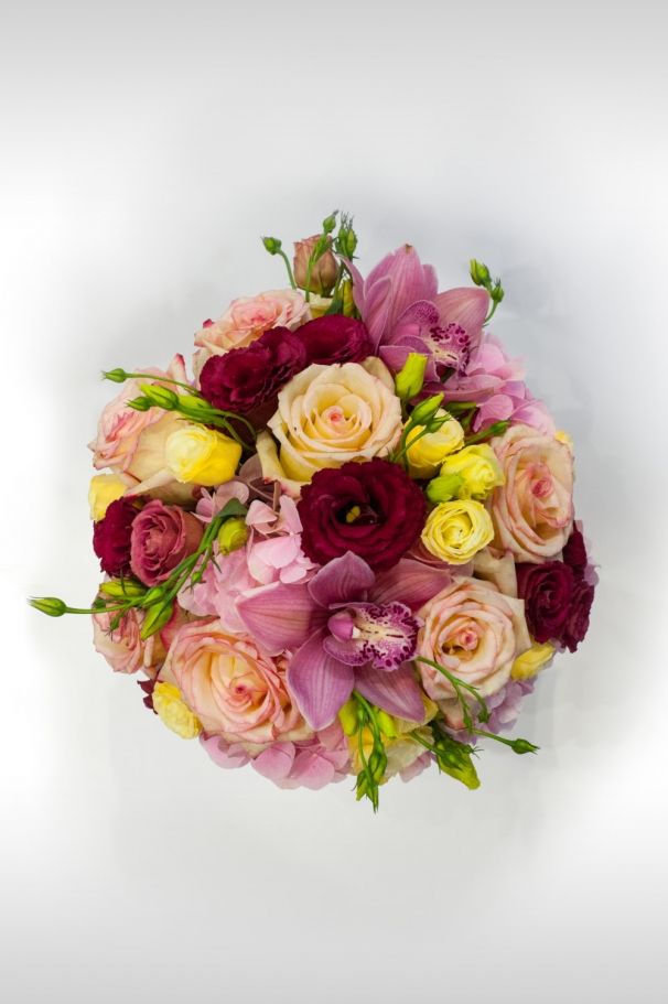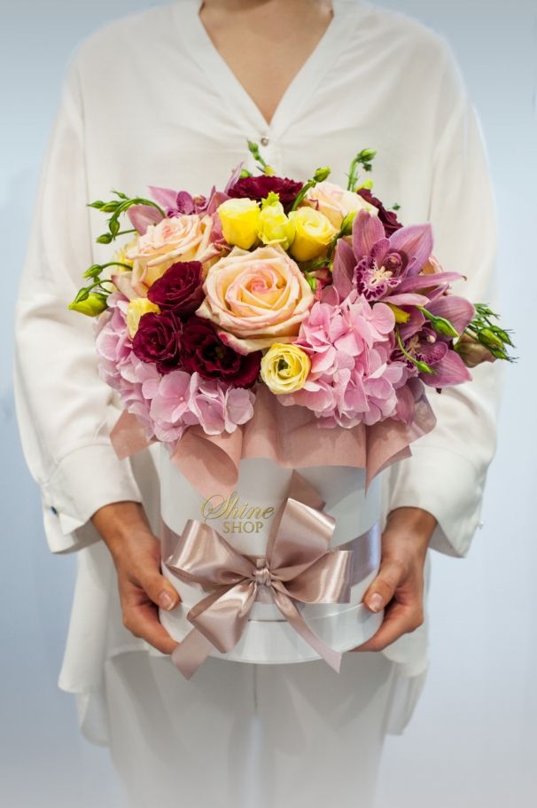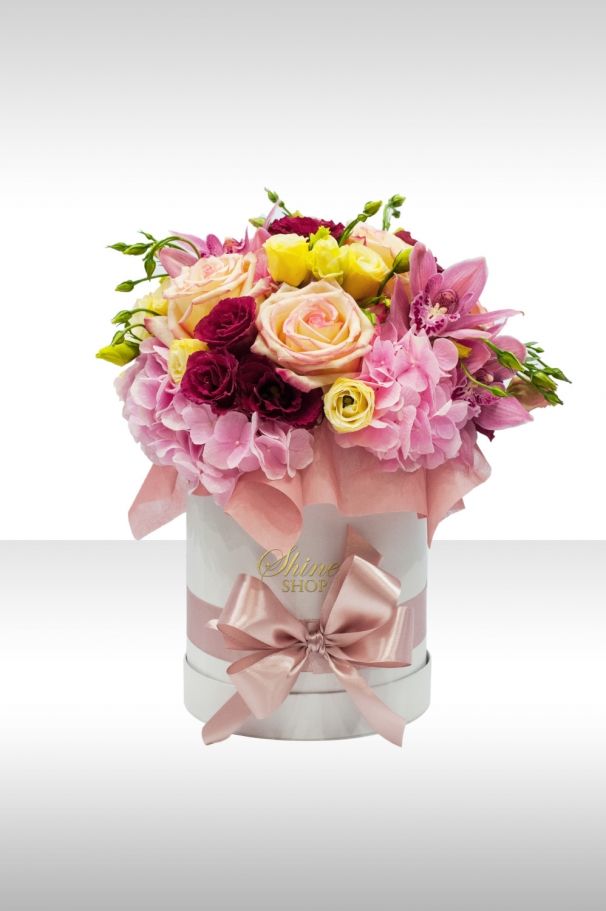 Луксозна бяла кутия с цветя, нежна сатенена панделка в цвят екрю и експлозия от цветове – това предложение няма да остави безразлична нито една дама. Трудно е да определим звездата на тази кутия – може би нежните рози в цвят екрю, които са толкова деликатни, но все пак неустоими. Подчертаваме този нежен нюанс и с еустоми в същия цвят. Красиви розови орхидеи са допълнителен акцент, но повече розово никога не е излишно, а то идва под формата на пищна розова хортензия. За да има още малко цвят и дълбочина в кутията, добавяме еустоми в цвят бордо.