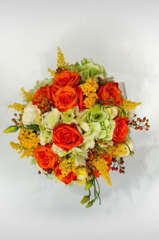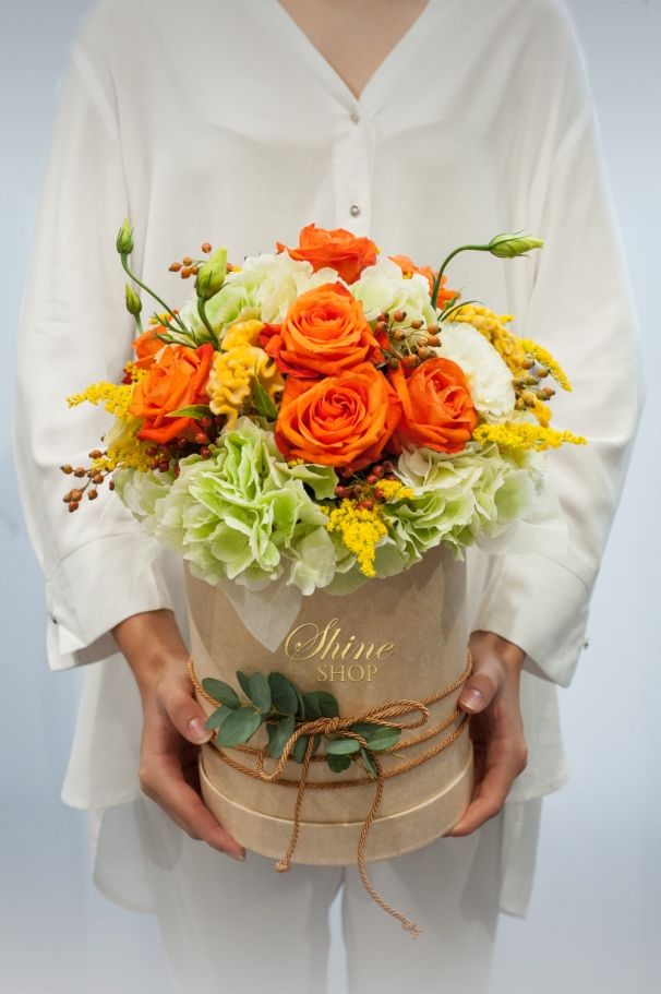 Тази стилна кутия с цветя в топъл земен нюанс съдържа истинска феерия от свежи цветове, които носят настроение и ще се превърнат в акцент на всеки дом. Оранжево, жълто, бяло и малко зелено – кой би отказал да се потопи в тази красота. Звездата на кутията са оранжевите рози, подходящи за подарък с повод или без. Белите еустоми са съвършенство, което прави тази кутия много нежна. Добавили сме и жълти целозии, за да бъде цветовата комбинация наистина много свежа. Кутията завършваме със зелени хортензии и зеленина солидаго. Малка панделка от въже шнур е последният детайл.