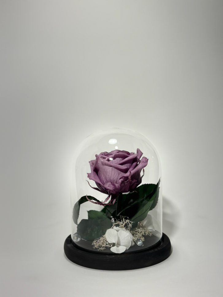 Вечната роза в стъклен купол – стилен акцент и израз на нежност, който съхранява красотата завинаги.