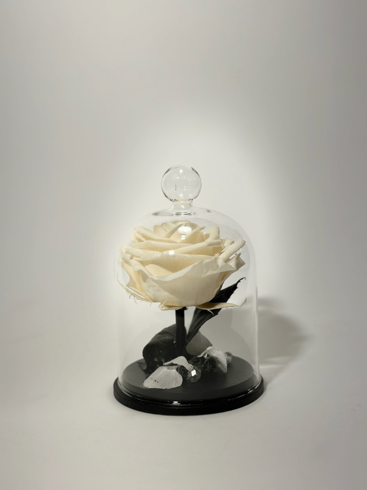 Вечната роза в стъклен купол – стилен акцент и израз на нежност, който съхранява красотата завинаги.