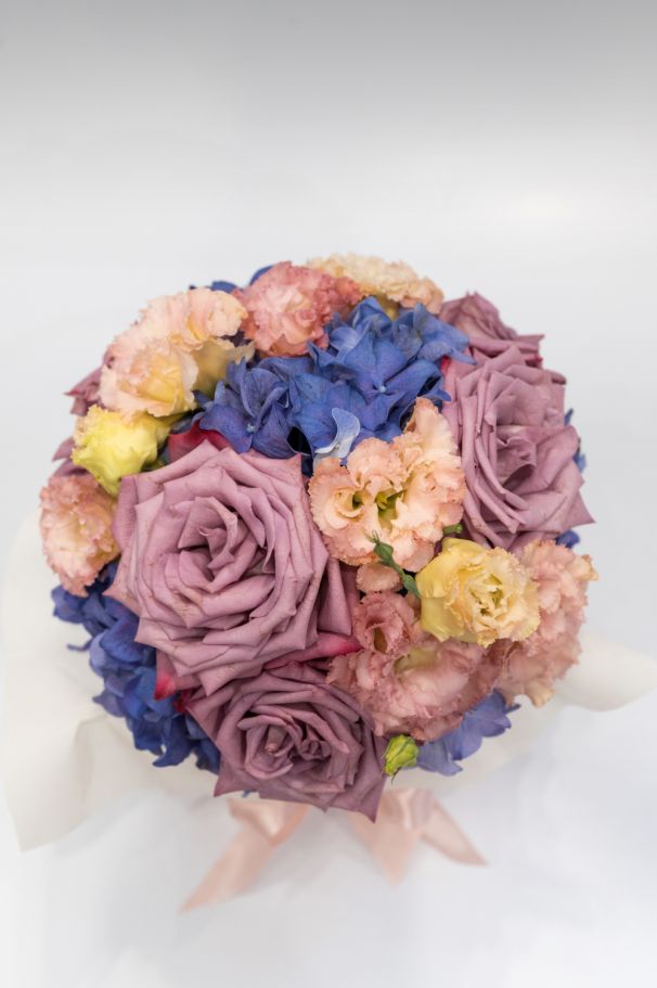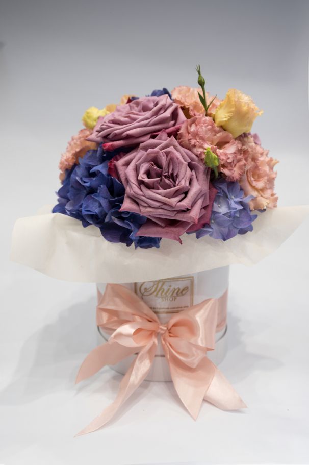 Нежно лилавите тонове на розите в тази кутия с цветя комбинираме със силен и категоричен синьо-лилав нюанс на хортензиите. Розите са големи, разцъфнали и носят настроение за цветна градина. Хортензиите правят всеки букет по-пищен и по-красив, а за да направим палитрата наистина впечатляваща добавяме красиви еустоми в нежни жълто-оранжеви нюанси. Няколко розови пъпки в жълто ще направят цветната Ви кутия по-издръжлива, за да може да се радвате на красотата ѝ по-дълго.