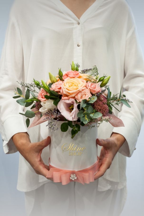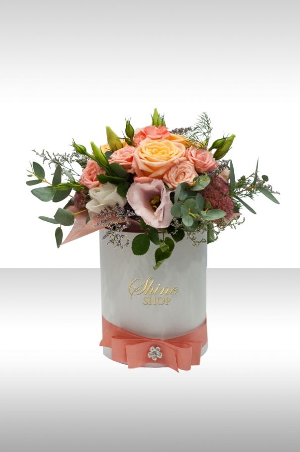 Два вида рози правят тази кутия с цветя наистина специална. Едните са наистина нежни и деликатни в красиви розови нюанси и носят полъха на пролетта. Но за още по-специална визия на тази кутия сме добавили три спрей рози в жълто. Белите еустоми се комбинират отлично с всичко и правят букета по-нежен и балансиран. На пищните и красиви рози в кутията деликатно контрастират фините лилави цветове на лимониума. Зеленината, която сме добавили, е евкалипт и листа от красула.