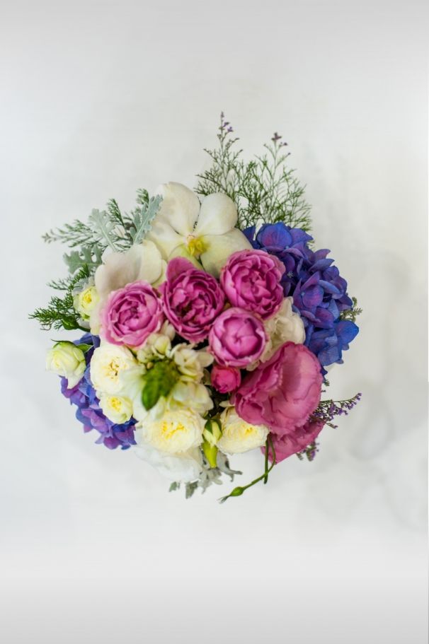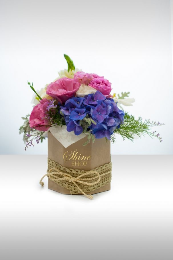 В тази стилна осмоъгълна кутия с цветя в нежен земен нюанс сме събрали истинско богатство и разнообразие от цветове и видове цветя. Започваме с розови спрей рози, които са най-красивият акцент в кутията. Добавяме бели еустоми и бели орхидеи – дотук цветовата комбинация е класическа. Лилавата хортензия придава пищност и богатство на цветовете на тази кутия, а зеленината е лимониум и евкалипт. Тази красива кутия завършваме с фин последен щрих – деликатна дантела и шнур, завързан на панделка.